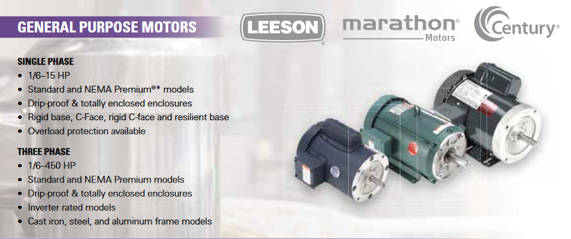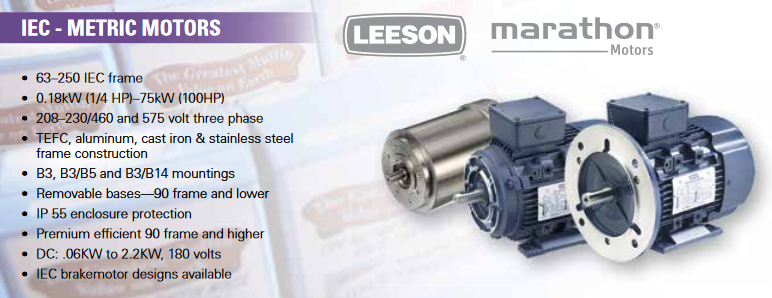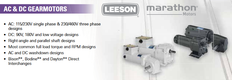 LEESON is a manufacturer of electric motors, gearmotors and gear reducers for use in industrial and commercial applications. LEESON products include AC / DC motors, sub-fhp motors and gearmotors, adjustable speed drives, NEMA Gear+Motors, and right-angle gear reducers. Over 4,000 items available in-stock!