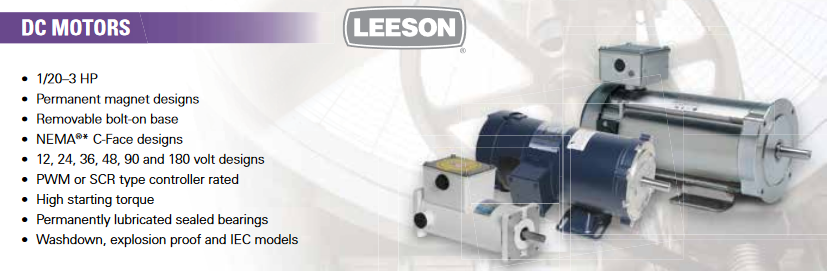 LEESON is a manufacturer of electric motors, gearmotors and gear reducers for use in industrial and commercial applications. LEESON products include AC / DC motors, sub-fhp motors and gearmotors, adjustable speed drives, NEMA Gear+Motors, and right-angle gear reducers. Over 4,000 items available in-stock!